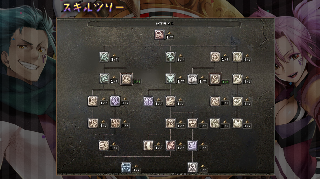 道化師のスキルツリーは「セブライト」一本しかなく、スキルツリーのどの流れを強化するかという創り方で個性を出す仕様になっています。