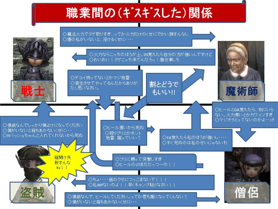 そのシーフさんの考えだと「ヘイト管理はファイターの仕事!」ってことだったようで、たしかにファイターはそういう職業なのでそれは間違いないのですが、それを押し付けてはいけません。