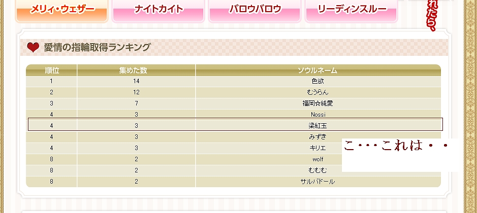 ふぅーん・・・まあ、いいや。メリィウェザー1のモテキャラはだれなのかな・・・と開いてみると・・・